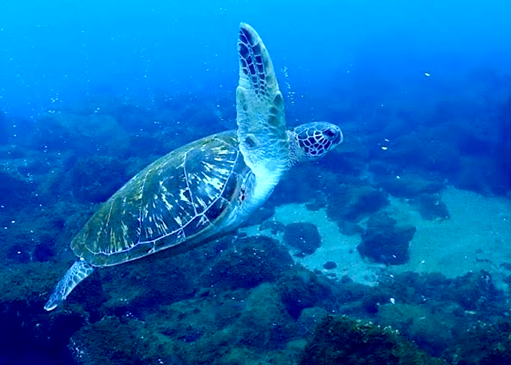 式根島のいたる所で見る事のできるアオウミガメ。 近づくと逃げてしまう事が多いですが海中温泉で温浴中のアオウミガメは近づいてゆっくり見ることができます。