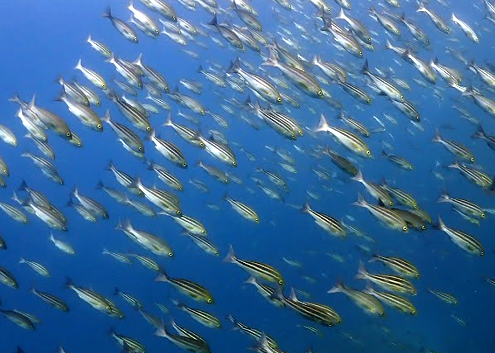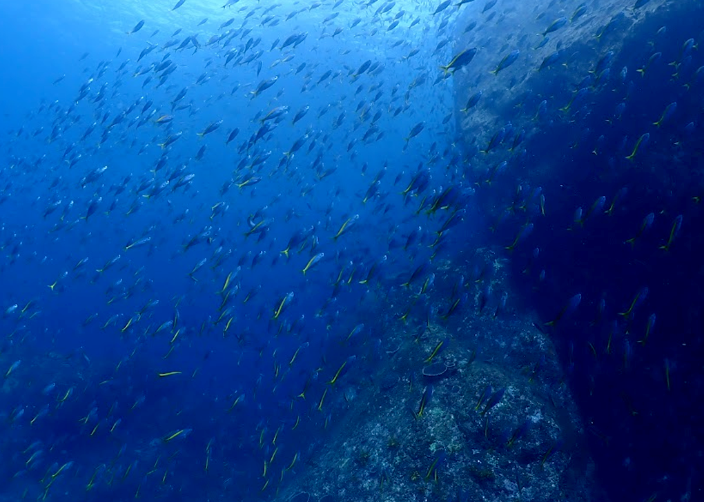 岩礁沿いに群れるクマザサハナムロは、銀色に輝く群れが光を反射し、水中に立体感を生みます。流れに沿った群泳や群れの密度感は写真映え抜群。旬の初夏には刺身や煮付けでも楽しめます。