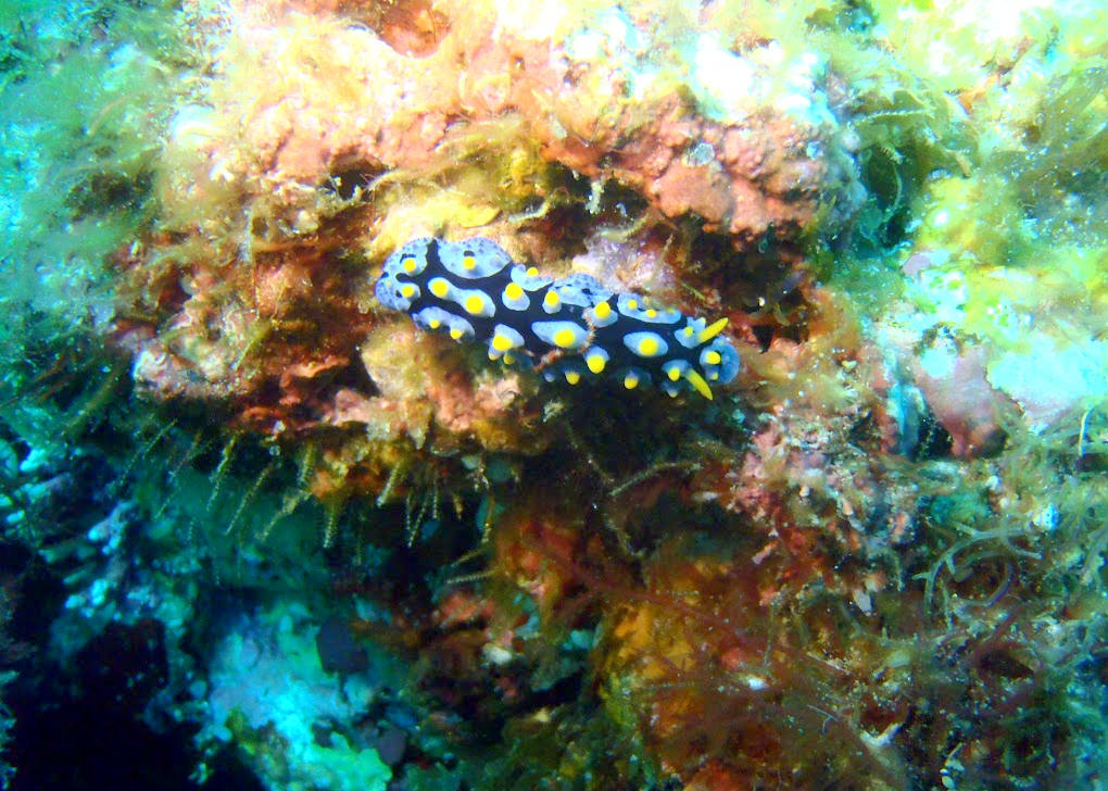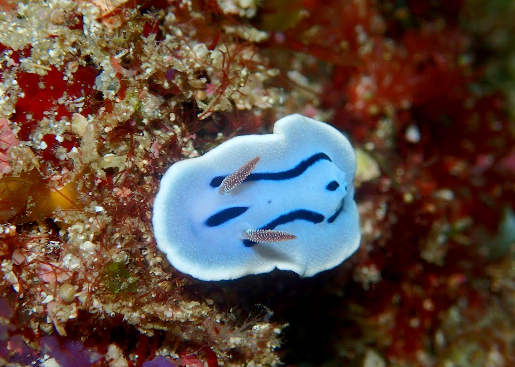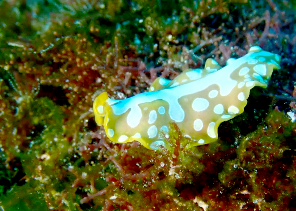 式根島の岩礁や砂地の隙間では、冬から夏にかけて多彩なウミウシが登場します。体長数ミリから数センチの小さな体に、原色の模様や半透明の質感が魅力。 寒い季節の海を彩る、小さなアートのような存在です。