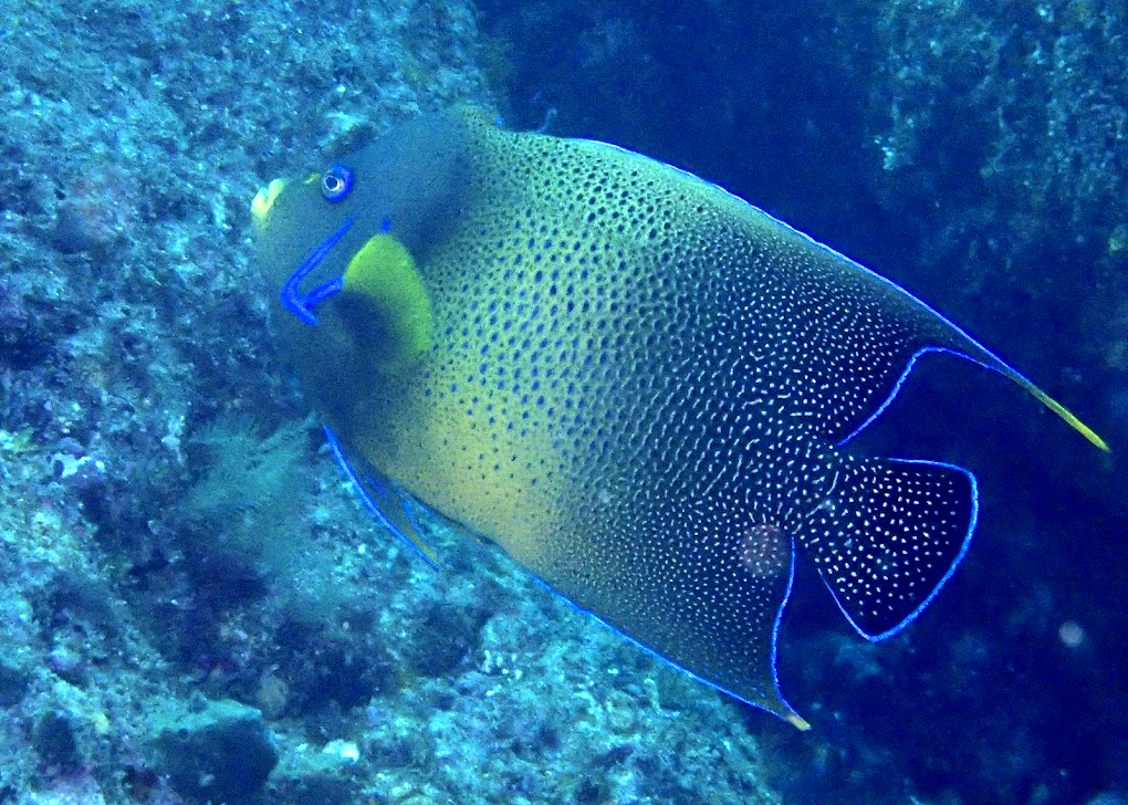 岩場やサンゴの隙間で見られるサザナミヤッコは、青と黄色の鮮やかな体色が印象的。単体で泳ぐ姿は光と岩肌のコントラストが美しく、撮影映え抜群です。